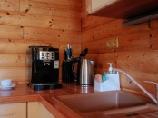 Kuchyňa: chladnička, mraznička, varná kanvica, mikrovlnná rúra, sklokeramická varná doska, jedálenský kút, kuchynský riad